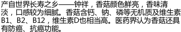 随县香菇尤以花菇质佳,其菌柄短壮,肉质肥厚,花纹明显,美观匀称,香味浓郁。香菇子实体内含有一种可以降低血液中胆固醇的成分,能防止动脉硬化和血管变脆,有益于肝脏。