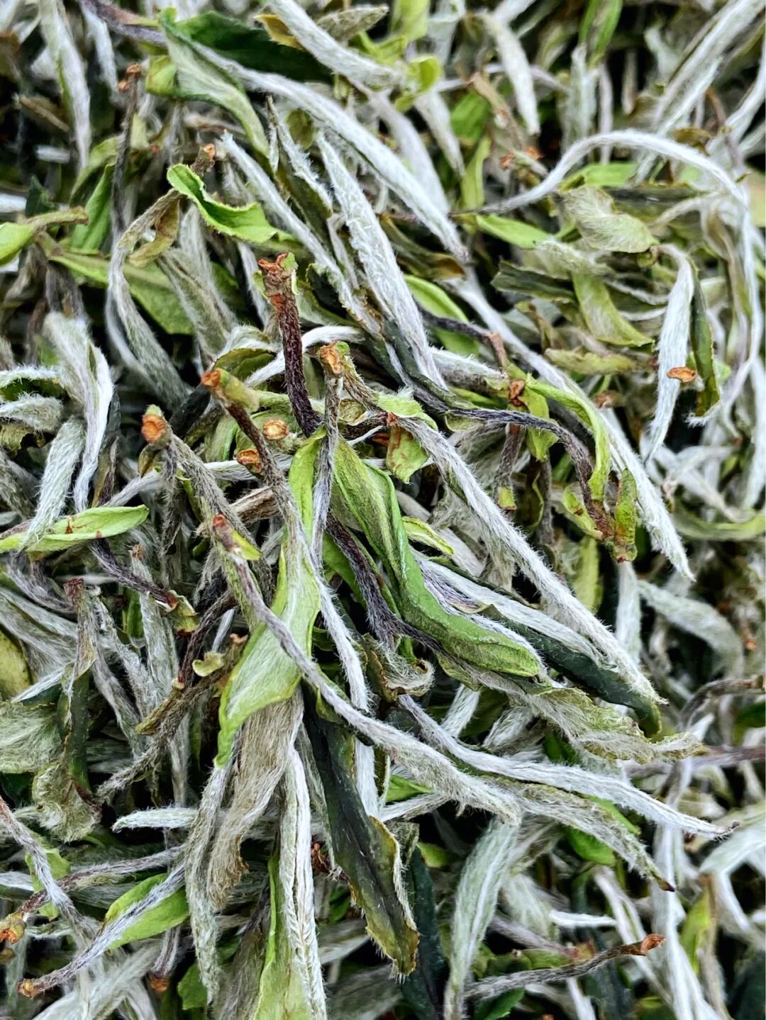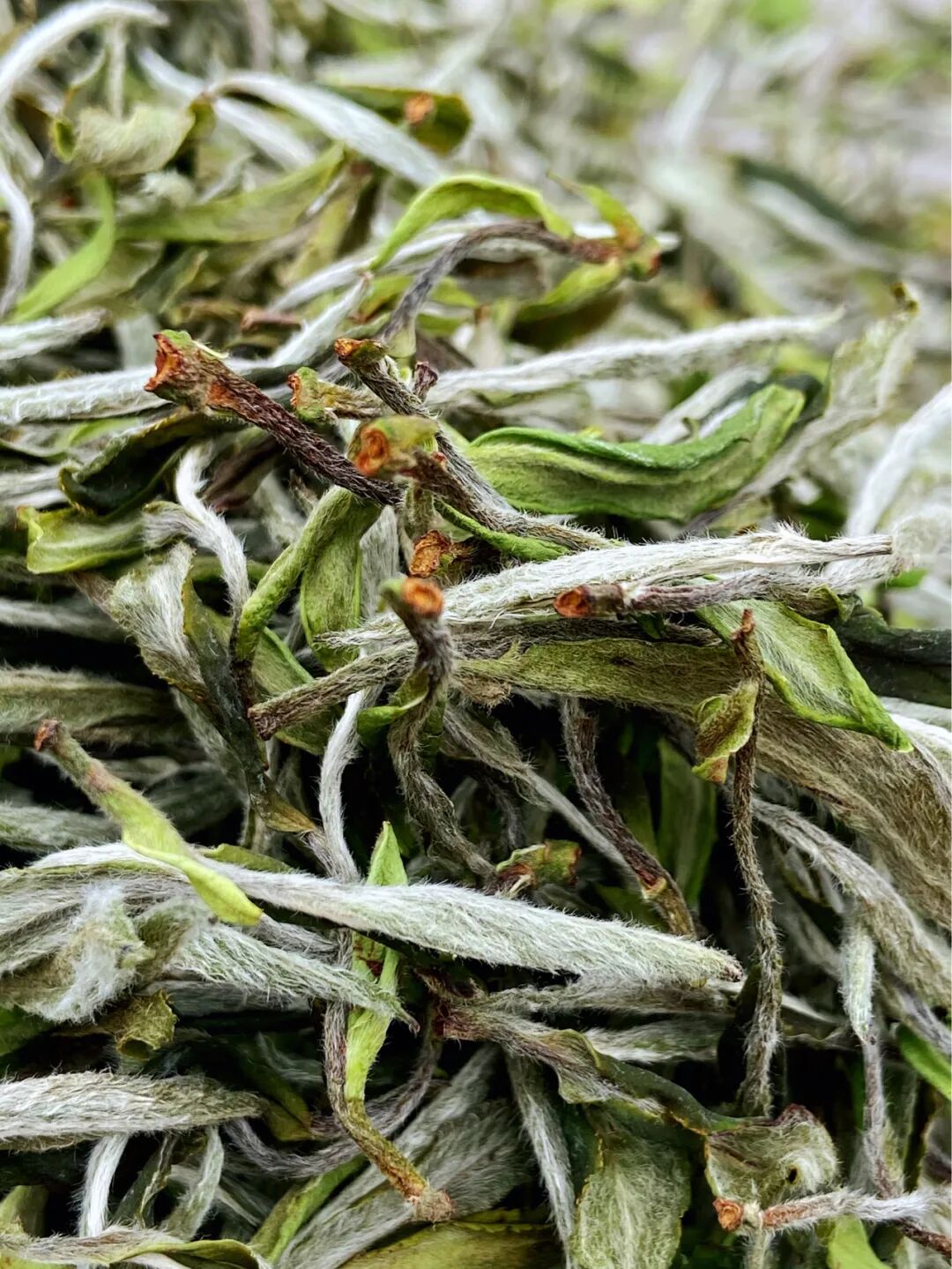 常见的白牡丹茶的外形特征为一芽一叶一芽二叶,带明显毫心,不同等级的白牡丹所带的毫心肥壮程度不等。