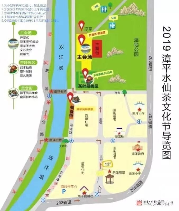 备注:为确保2019年11月23日茶文化节交通安保安全、有序地进行,红狮车停运一天。南洋镇旅游公路小型轿车双向行驶(禁止大中型车辆进入);①号路口小型车辆可以驶入,禁止驶出;②③④⑤等路口均禁止小型以上车辆进出;⑥号路口禁止小型车辆通行及停放;交通管制时间2019年11月23日8时至15时