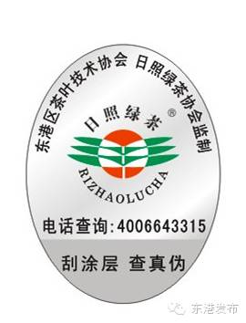 “日照绿茶”防伪标签为椭圆形电码查询防伪标识,中间为商标标识,上方标注“东港区茶叶技术协会、日照绿茶协会监制”字样,下方为查询电话和防伪涂层。