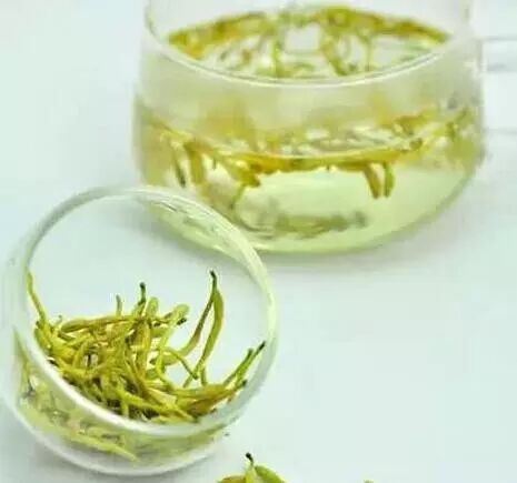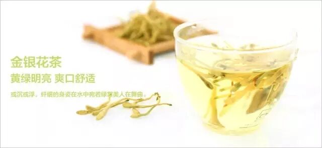 金银花又称忍冬花。忍冬是半常绿灌木,茎半蔓生,叶卵圆形,开喇叭形的花朵。初开花时白色,后逐渐转变为黄色,这是“金银花”名称的由来。金银花茶是一种新兴保健茶,茶汤芳香、甘凉可口,畅销国内外市场。常饮此茶,有清热解毒、通经活络,护肤美容之功效。