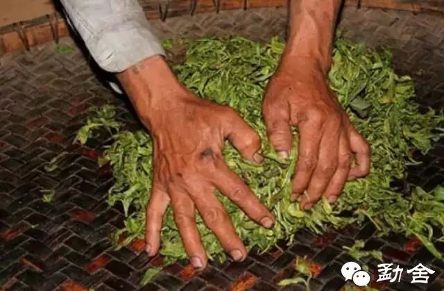 ▲杀青后的茶叶要经过纯手工反复揉捻,以破坏茶叶叶表组织茶汁浸出,使片状鲜叶揉捻成条索状。