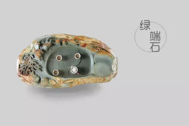 绿端石色青绿微带土黄色,石质细腻、幼嫩、润滑,最佳者为翠绿色,纯浑无瑕,晶莹油润,别具一格。绿端采石始于北宋,关于砚坑的地点,据《高要县志》云:“绿端石出北岭及小湘江峡(即现在的三榕峡),鼎湖山、皆旱坑。”绿端砚石最早在北岭山附近开采是事实,可能因砚石枯竭,人们就终止于此开采,转移至端溪水一带的朝天岩附近开采,再后绿端砚石与朝天岩砚石混在了一起,即上层为绿端,下层为朝天岩。