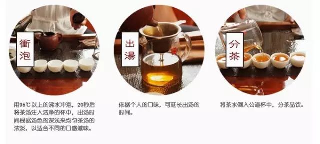 3、冲泡技巧:根据茶品特点适时调整投茶量、茶水比、浸泡时间(如黑砖茶砖身较紧实,冲泡时间宜稍长,散茶如天尖宜较快出水),投茶多、加水少、浸泡时间长则浓。冲泡策略:减少投茶量、快速出水。
