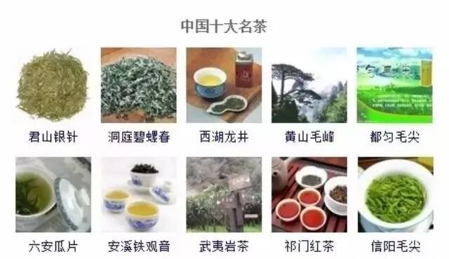 美联社和《纽约日报》2001年3月26日同时公布:西湖龙井,黄山毛峰,洞庭碧螺春,安徽瓜片,蒙顶甘露,庐山云雾,信阳毛尖,都匀毛尖,安溪铁观音,苏州茉莉花是中国的十大名茶。
