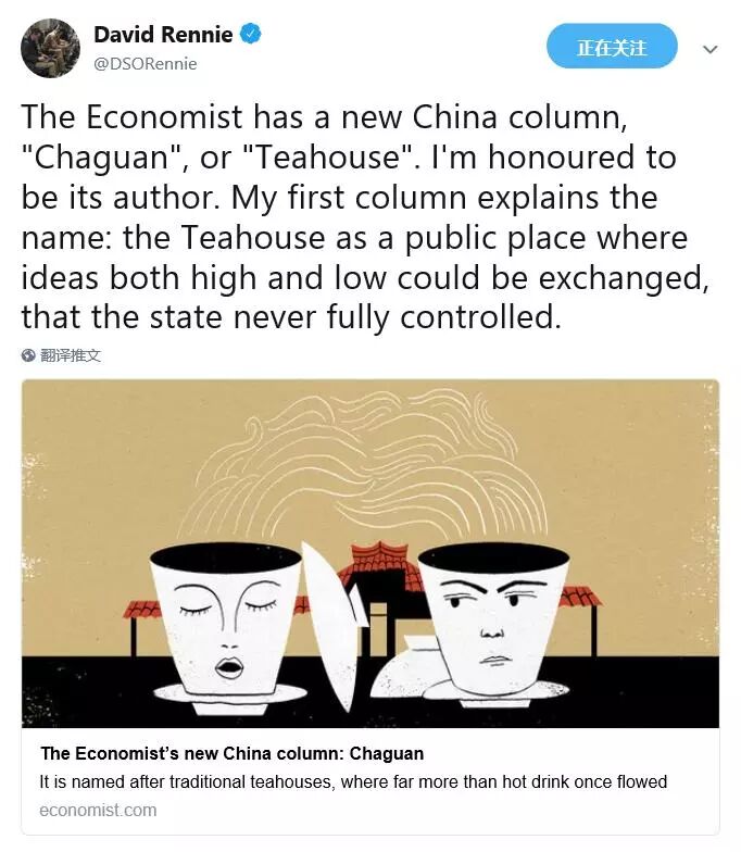 《经济学人》新开了一个专栏,名字叫Chaguan(茶馆),该专栏的负责人 David Rennie 在推特中介绍说: