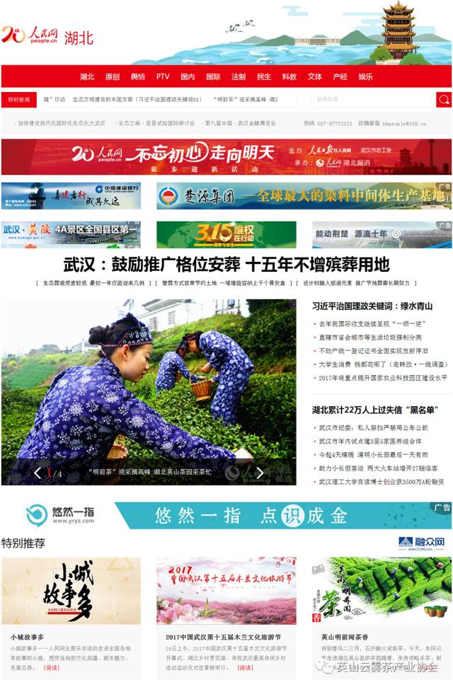 据人民网湖北频道相关人员介绍,图文直播预计浏览量在百万人次以上,同时直播次日人民网湖北频道以“明前茶迎采摘高峰,湖北英山茶园采茶忙”为题发布首页新闻,更使英山云雾茶成为人民网湖北频道“网红”。