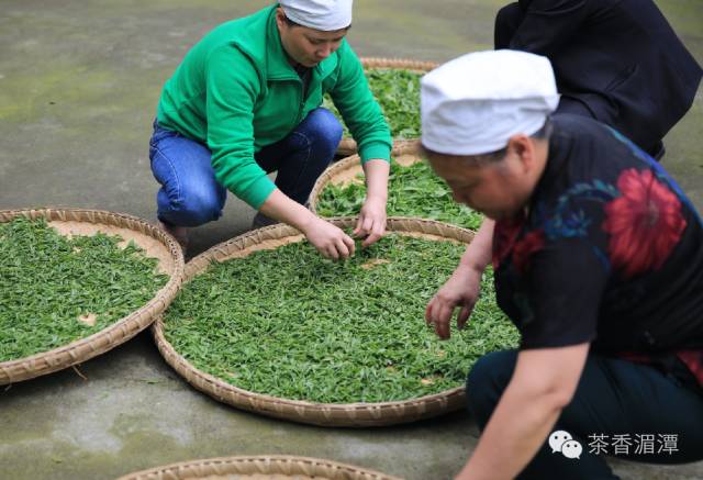 其传统制作技艺考究,主要包括:采摘鲜叶—摊青(鲜叶自然摊放)—红锅头炒(高温杀青)—摊晾(散热)—二炒(理条)—摊晾(回汗)—中锅三炒(压条定形)—摊晾(回潮)—磨锅(定形、提香)—拣屑(去片末)—瓦缸储藏(用木炭石灰垫底保鲜)—包装(皮纸封袋)等流程。当然,为了推进茶叶加工机械化和清洁化,人们通常喝的湄潭翠芽都是机械化生产的了。