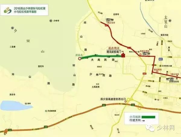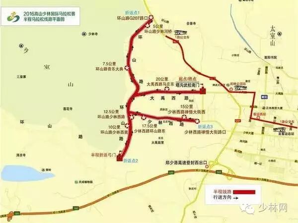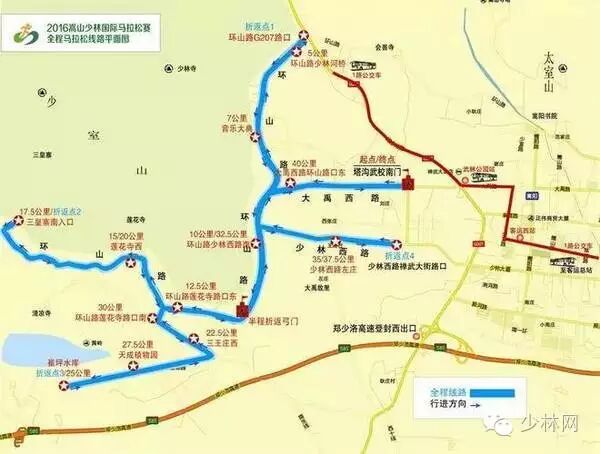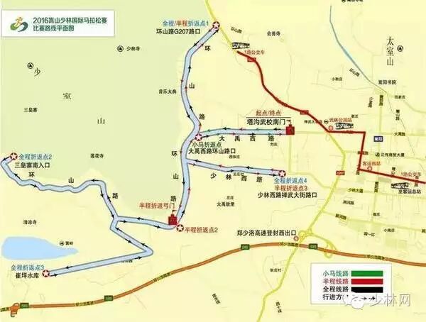 起点(塔沟南门)--大禹西路(向西)--大禹西路环山路口(向北)--音乐大典(向北)--环山路G207路口(折返点1)--音乐大典—大禹西路环山路口(向南)--环山路莲花寺路口(向北)—莲花寺(向西)--三皇寨南入口(折返点2)--莲花寺(向南)www.shaolinet.com--环山路莲花寺路口(向南)--三王庄(向西)—崔坪水库(折返点3)--三王庄(向北)--环山路莲花寺路口(向东)--环山路少林西路口(向东)--少林西路禅武大街路口(折返点4)--环山路少林西路(向北)--环山路大禹西路(向东)--终点(塔沟南门)