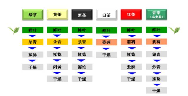 属于轻发酵茶,加工工艺近似绿茶,只是在干燥过程的前后,增加一道“闷黄”的工艺,促使其多酚叶绿素等物质部份氧化。其加工方法近似于绿茶,其制作过程为:鲜叶杀青揉捻、 闷黄、干燥。黄茶的杀青、揉捻、干燥等工序均与绿茶制法相似,其最重要的工序在于闷黄,这是形成黄茶特点的关键,主要做法是将杀青和揉捻后的茶叶用纸包好,或堆积后以湿布盖之,时间以几十分钟或几个小时不等,促使茶坯在水热作用下进行非酶性的自动氧化,形成黄色。