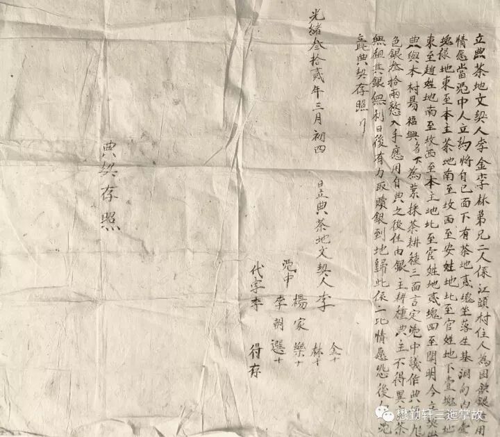 下图中为光绪三十二年,江头村茶农李金、李林典卖茶园之典契一份: