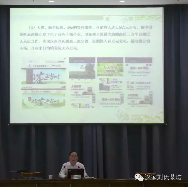 四、创新产品营销模式,构建全球营销网络。通过世界刘氏总会和电商模式,2015年合作社和公司实现综合销售收入13亿元。在国内建立专卖店86家,建加盟店330多家,配送店10000多家,10万人参与汉家刘氏的营销活动。已与顺丰、阿里巴巴、沃尔玛、中百、武商、中石化、九州通、南航、武汉铁路局、中烟、包钢等国内知名企业建立战略合作伙伴关系。天猫、顺丰优选、融e购等网络年营销收入达1.5亿元左右,被中国茶叶流通协会授予电子商务十强企业。现在和全国最大的微商第三方平台微巴人人店合作,实现汉家刘氏微商三级分销,近期投入百万元豪礼,撬动微分销市场,开业来日均销货达50多万元。 五、我们实现走出去战略,响应“一带一路”战略规划。2014年,合作社将走出国门当成第一战略规划。适逢习近平主席提出的“一带一路”战略。随着地球村的形成,部分外国小孩子开始习惯饮中国茶,部分中国文化爱好者喜欢品中国茶。特别英国、俄罗斯、美国、澳大利亚等地中国菜和中国茶的影响很大。 我们的主要精力就放在如何走出去上。比如2015年12月19日中非文化大使捷盖率团考察汉家刘氏茶业,因喀麦隆有专家认定汉家刘氏黑茯茶对预防艾滋病有好处,捷盖计划在非洲推广并预邀喀麦隆、尼尔尼亚、南非总统考察汉家刘氏茶业。