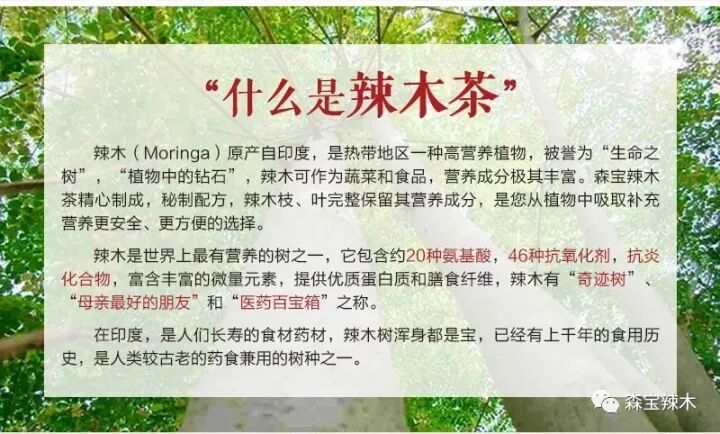 3、辣木产品具有降火除湿、排毒利便的辅助治疗功效,对长期缩便、秘便患者具有极为显着的辅助治疗作用,一般连续服用10日可见奇效。