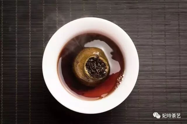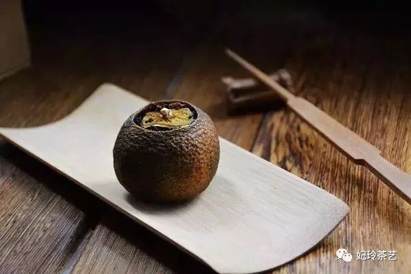 ② 戳孔冲泡:用茶针或茶刀在柑果果身上扎几个孔之后,孔大小以不漏碎茶为宜,依照整颗冲泡法冲泡。这种方法随稍显繁复,却颇有雅趣,而且冲泡出的茶汤徐徐浸出,口感清甜润泽,浓度与香气适中,耐泡度也非常好,同时茶汤从小孔中丝丝缕缕渗出,产生云雾变化般的现象也颇具赏玩的意趣。