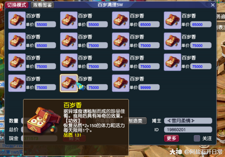 先在不同摊位找同品质情况下,价格最低的百岁香。然后在价格最低的摊位,以每10品差价1.1W,选择性价比最高的百岁香。