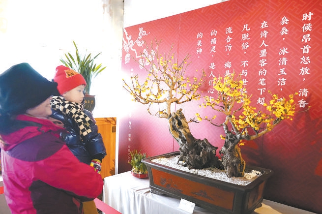 “傲骨幽香”梅花、蜡梅迎春文化展共展出梅花、蜡梅树桩盆景及其它植物百余盆,在梅花盆景之间还穿插展出了古桩盆蜡梅盆景。 本报记者 刘平摄