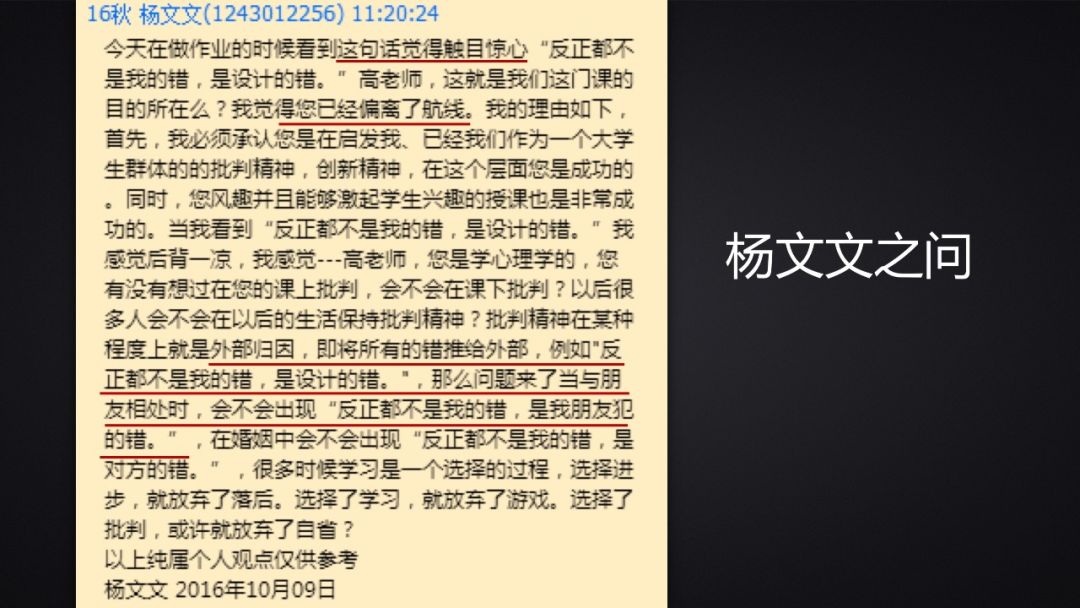 我觉得这个思考是非常非常好的,为了表示感谢,我把它命名为“杨文文之问”。每当我讲完这个理念的时候,我都要给学生说一下,有这样的一个问题,我对它的看法是什么样子的。