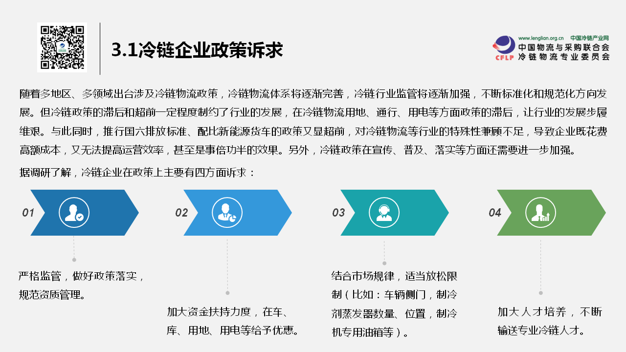 随着多地区、多领域出台涉及冷链物流政策,冷链物流体系将逐渐完善,冷链行业监管将逐渐加强,不断标准化和规范化方向发展。但冷链政策的滞后和超前一定程度制约了行业的发展,在冷链物流用地、通行、用电等方面政策的滞后,让行业的发展步履维艰。与此同时,推行国六排放标准、配比新能源货车的政策又显超前,对冷链物流等行业的特殊性兼顾不足,导致企业既花费高额成本,又无法提高运营效率,甚至是事倍功半的效果。另外,冷链政策在宣传、普及、落实等方面还需要进一步加强。