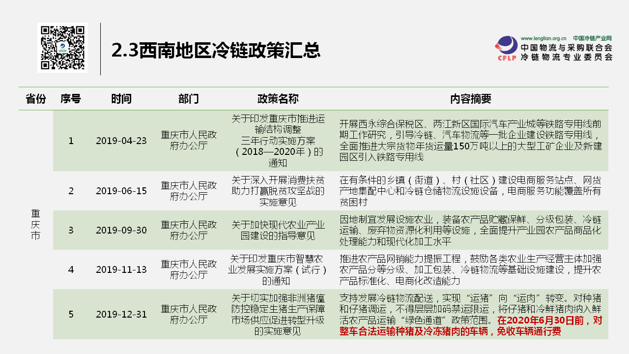 受非洲猪瘟的影响,2019年在国家层面生猪运输类冷链相关政策文件出台了3项,均鼓励变“运猪”为“运肉”,同时给予很大程度的优惠和扶持,如整车合法运输冷冻猪肉的车辆免收车辆通行费,冷链物流企业用水、用电、用气价格与工业同价等。
