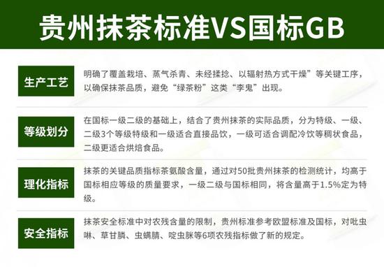 除抹茶园改造外,抹茶作为食品原料,对安全的要求标准更高,对农残和重金属的把控,也更加严格。2018年5月GB/T 34778-2017《抹茶》新国标正式实施,对抹茶的术语、定义、要求、试验方法等都做出了规定。然而,国标提供的仅仅是基础标准;贵州标准,则是补充和升级,代表中国可以做出高品质的抹茶。除此之外,在抹茶生产企业内部依旧还有等级分类。