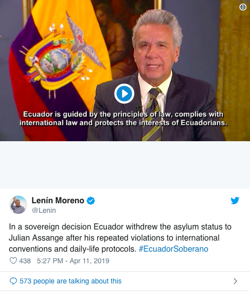 本文:厄瓜多尔总统发表声明,解释为何取消对阿桑奇的庇护
