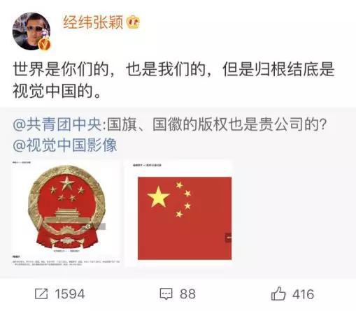 网友相继扒出国徽国旗在视觉中国上也有版权,这一行为引发了共青团中央的质疑。共青团中央微博反问“国旗国徽的版权也是贵公司的?”