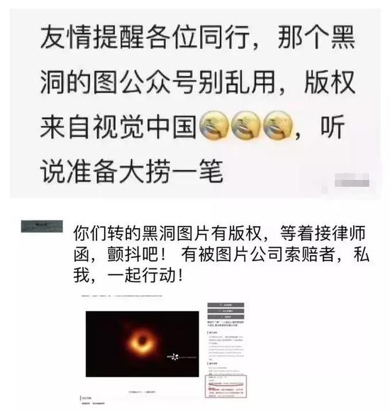 “友情提醒各位同行,那个黑洞的图公众号别乱用,版权来自视觉中国,听说准备大捞一笔。”